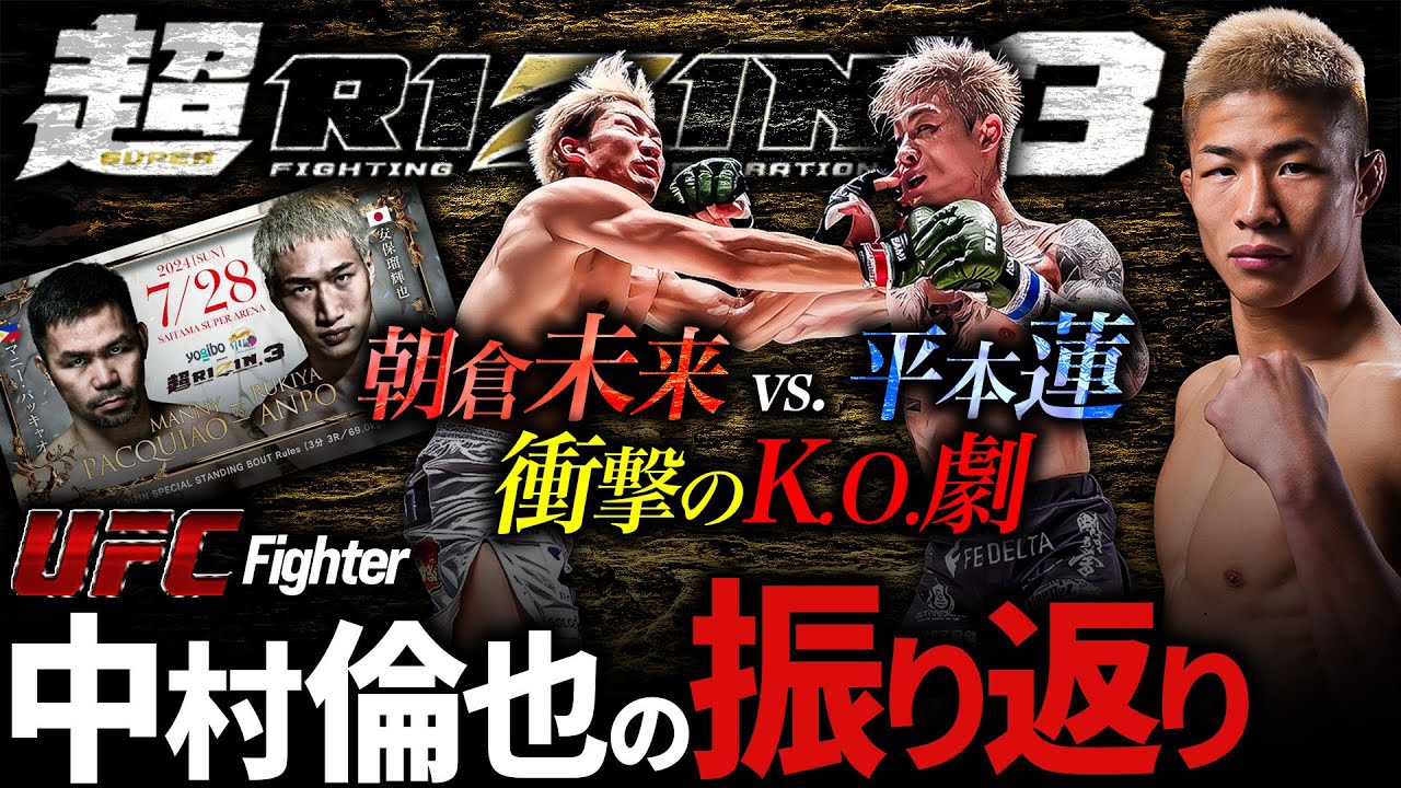 UFCファイターの中村倫也の2024年7月28日に行われた超RIZIN.3 の振り返りの後編で、メインカードの朝倉未来選手対平本蓮選手の試合について振り返ってくれました。また、マニー・パッキャオ選手対安保瑠輝也選手の試合についても語ってくれています!