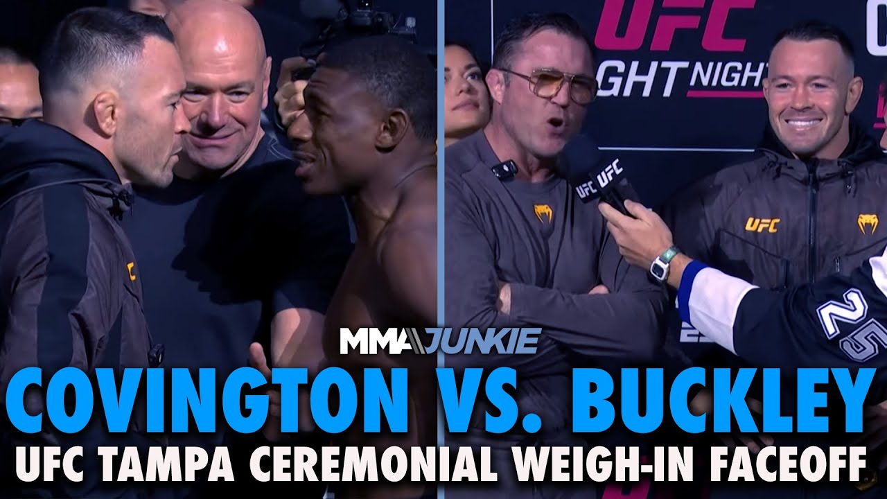 Former interim UFC champ Colby Covington and Joaquin Buckley had a final UFC on ESPN 63 faceoff at ceremonial weigh-ins ahead of their main event on Saturday in Tampa, Fla.